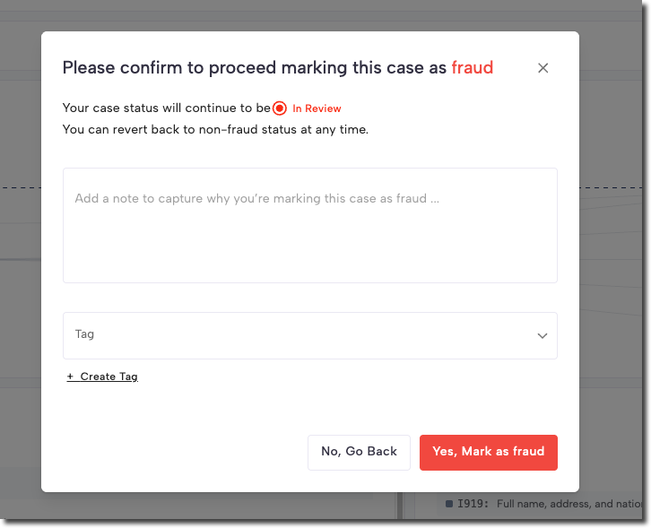 - After you click Mark as Fraud, a pop-up will appear, prompting you to provide details about the identified fraud.