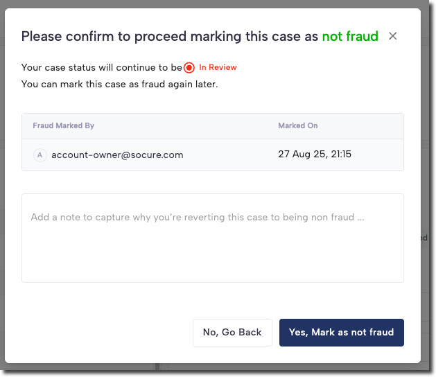 When this action is taken, a pop-up will appear, displaying the reason why the application was originally marked as fraudulent, and by whom. This window will also allow you to add notes explaining why the case is now identified as non-fraudulent.