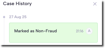 When confirming the Mark as Not Fraud action, the red background color in the case information header will be removed. The Case History view will also log a new event, marked by a green background, indicating that the case was reclassified as not fraudulent.
