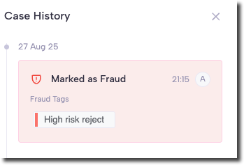 - A new event is added to the Case History view, also highlighted in red. This event indicates that the case was marked as fraudulent, displaying the user who took the action and the notes added to the case.