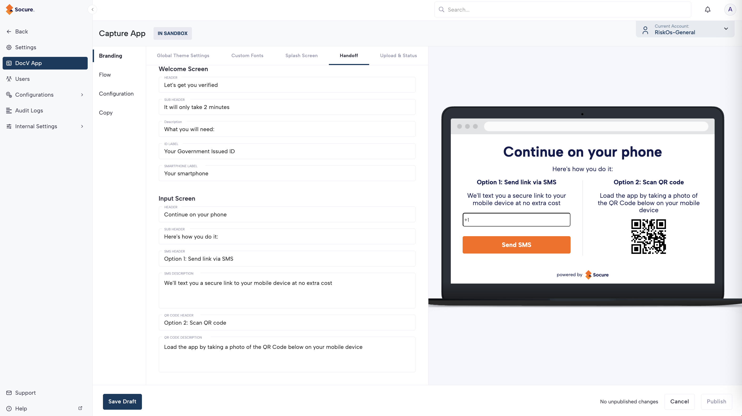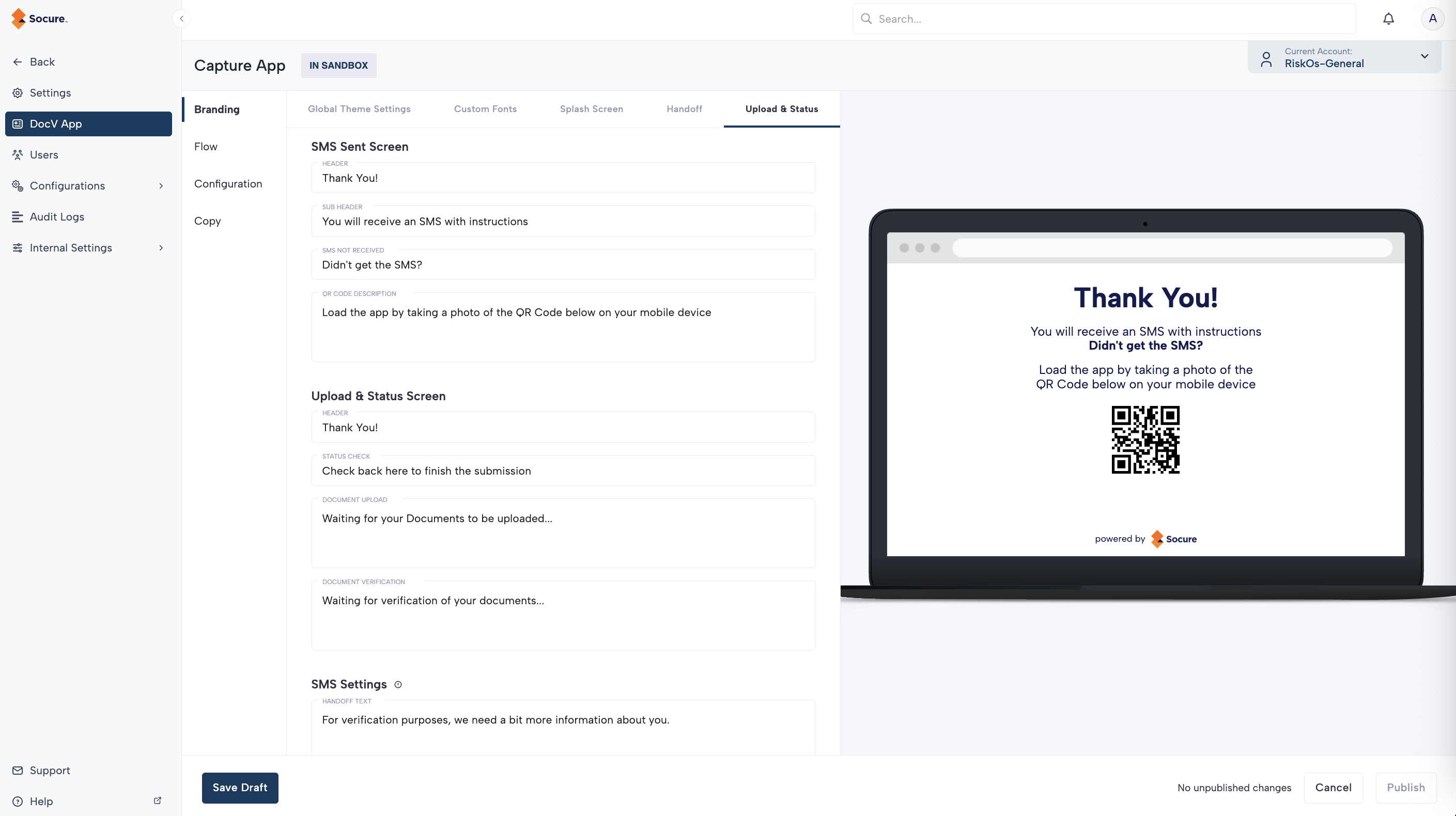 For DocV Web SDK integrations, the Upload & Status allows you to configure the text on the handoff component and the SMS text message.