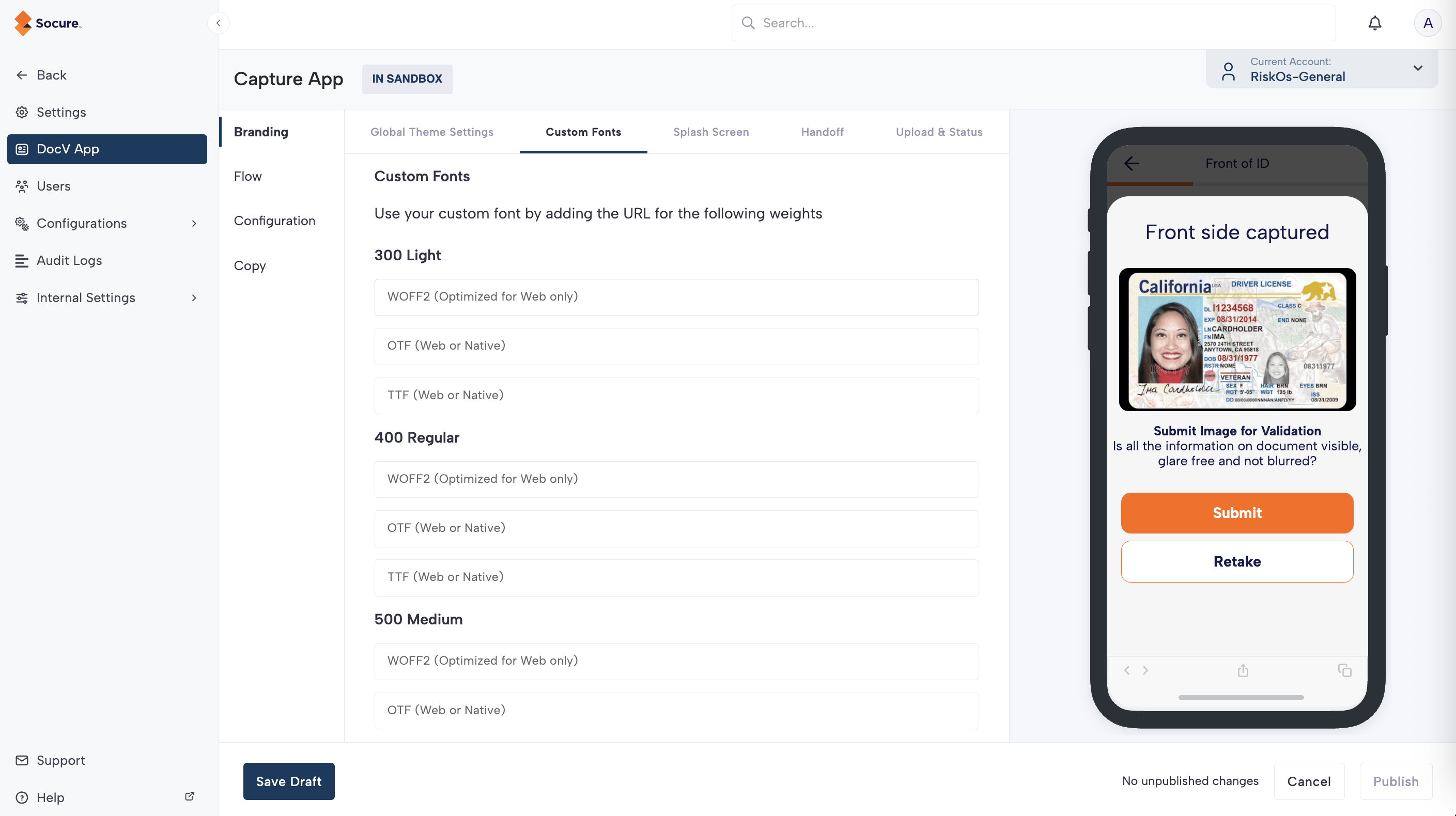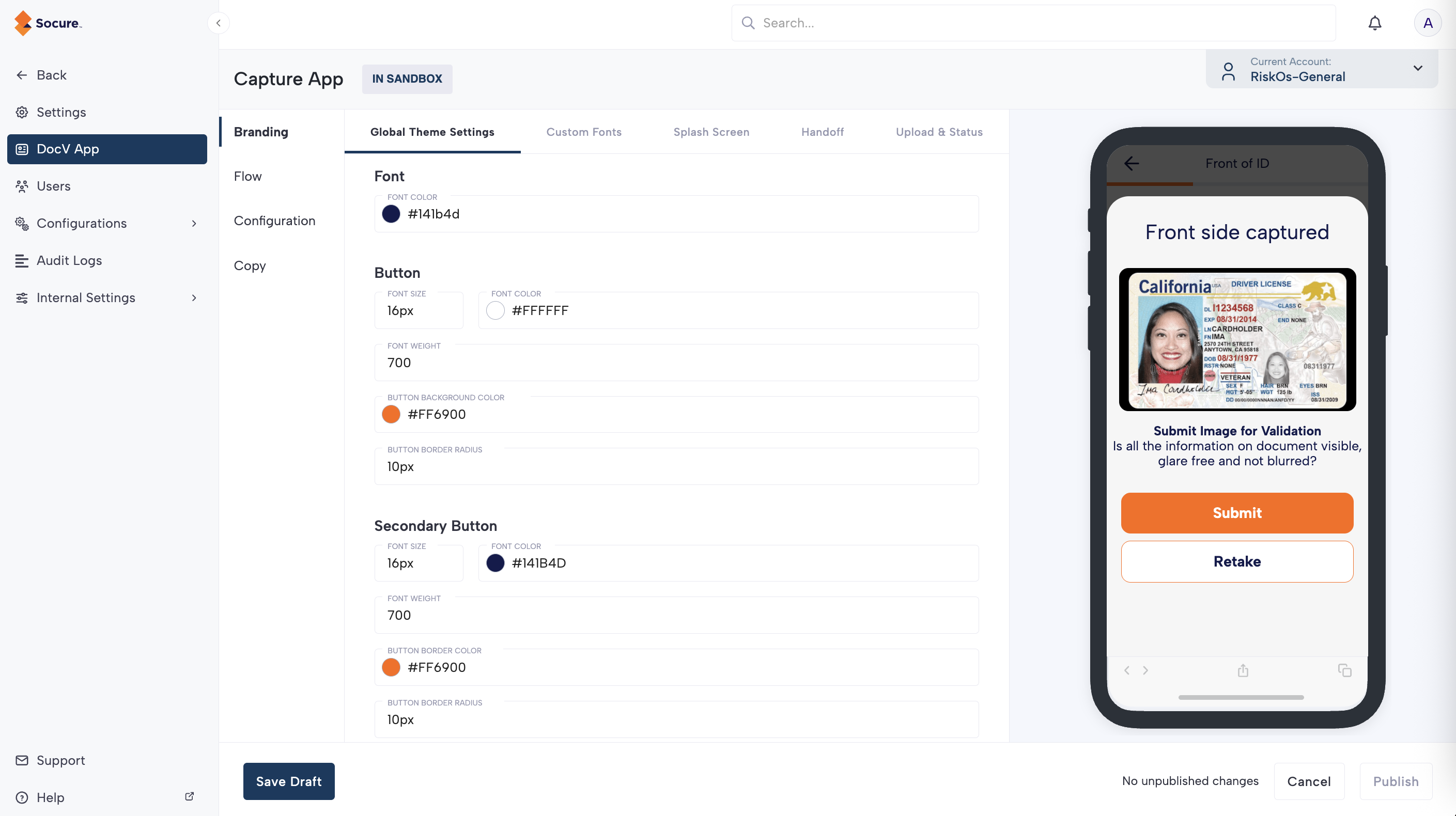 Create or edit Capture App flows—Document Verification, Secondary Document, Selfie Intelligence, or Selfie Reverification—inside the environment where they will run (Sandbox or Production).
