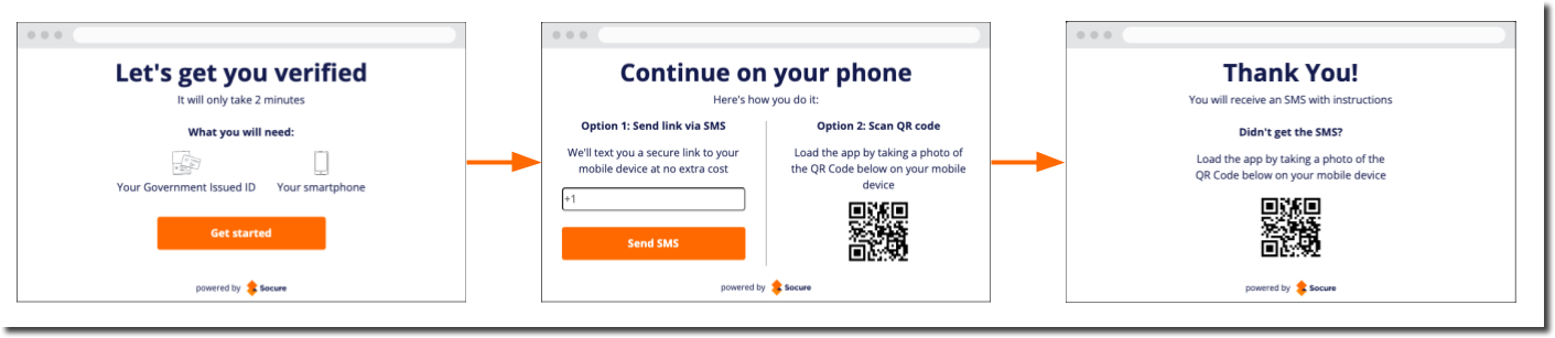For DocV Web SDK integrations, the handoff component redirects a consumer from their desktop browser to their mobile device using an SMS or QR code. If the consumer is already on a mobile browser, they will tap an Open button to open the Capture App in a new tab.
