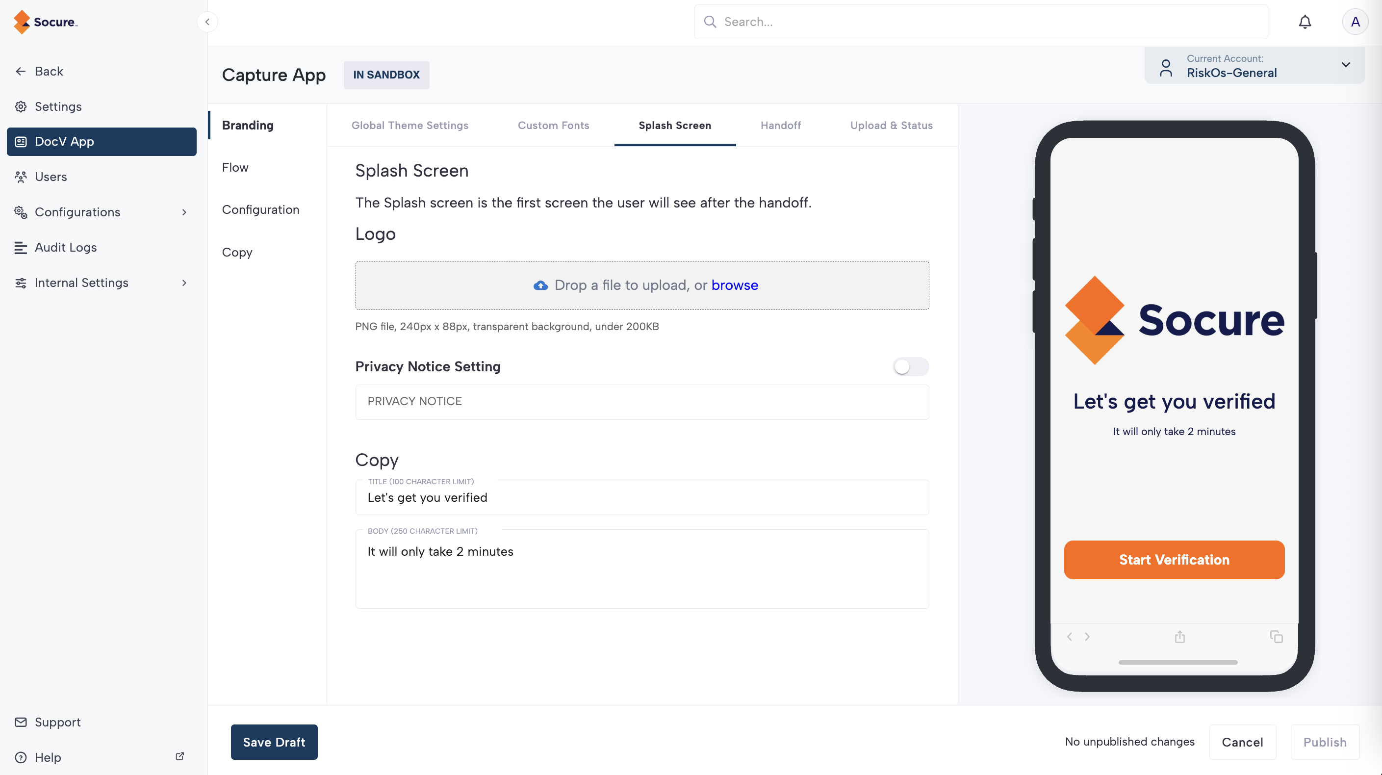 Go to Settings > DocV App in the RiskOS™ Dashboard Production environment.