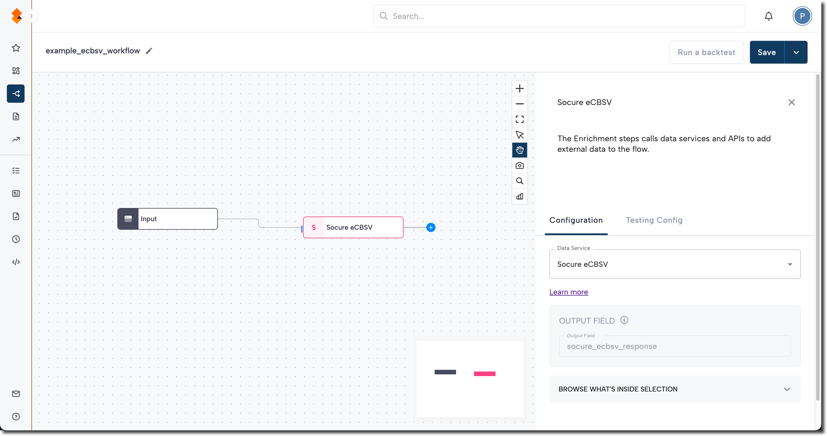 In RiskOS™, workflows are built by connecting reusable components. eCBSV is added as an Enrichment step.