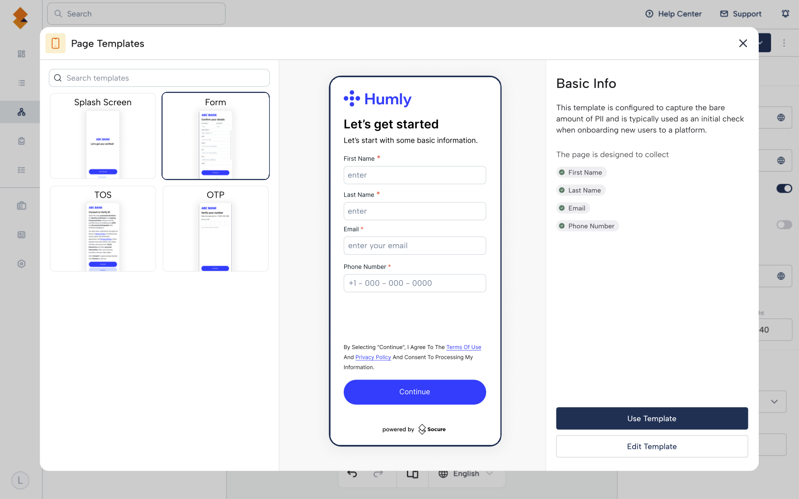 The Hosted Flow Builder provides a library of UX Page Templates and UX components you can add with the + icon. For each component you can: