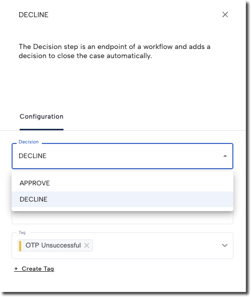 Approved,Pending, andDeclinedare the default decision values. Customers can customize the response to added or to delete default values based on specific workflow needs.