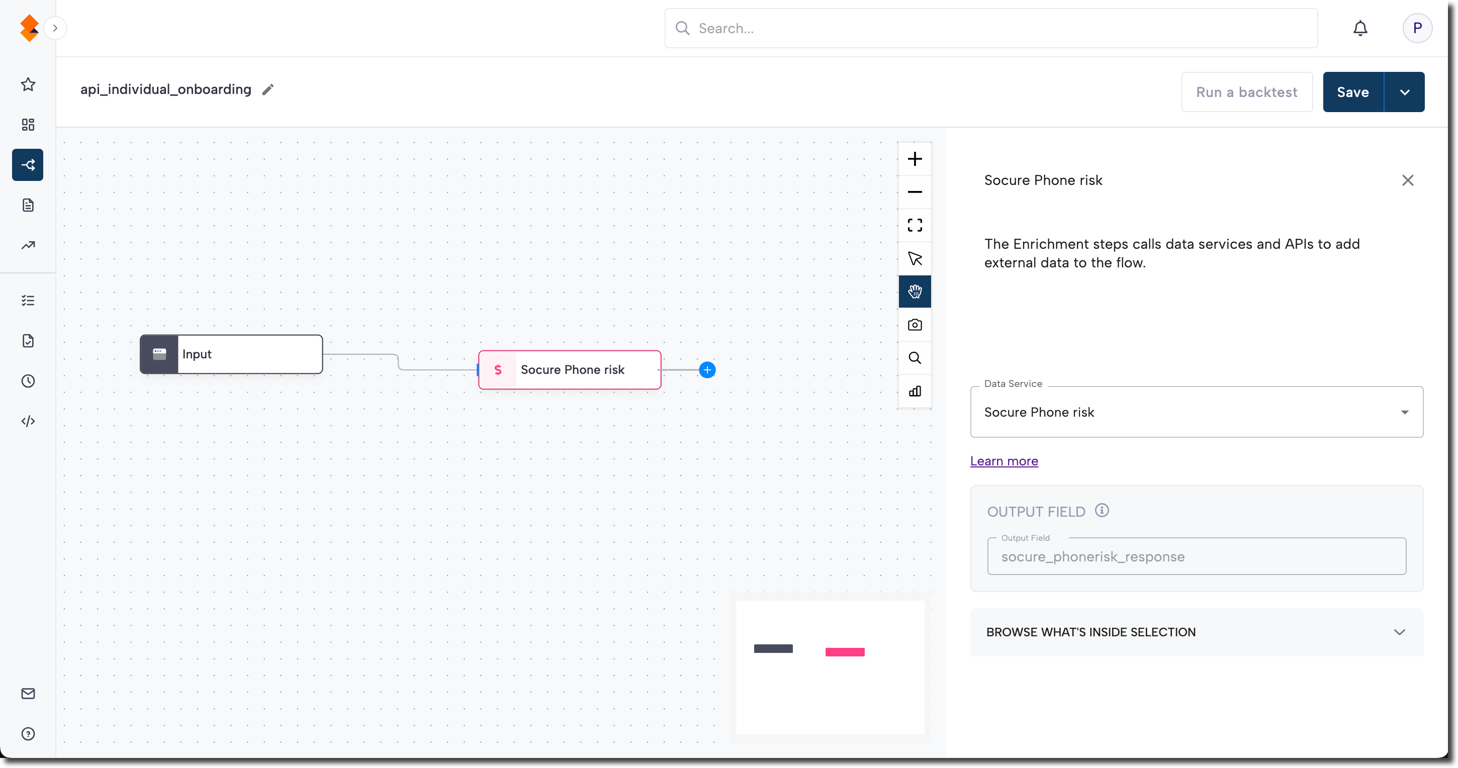 In RiskOS, workflows are built by connecting reusable components. Phone Risk is added as an Enrichment step.