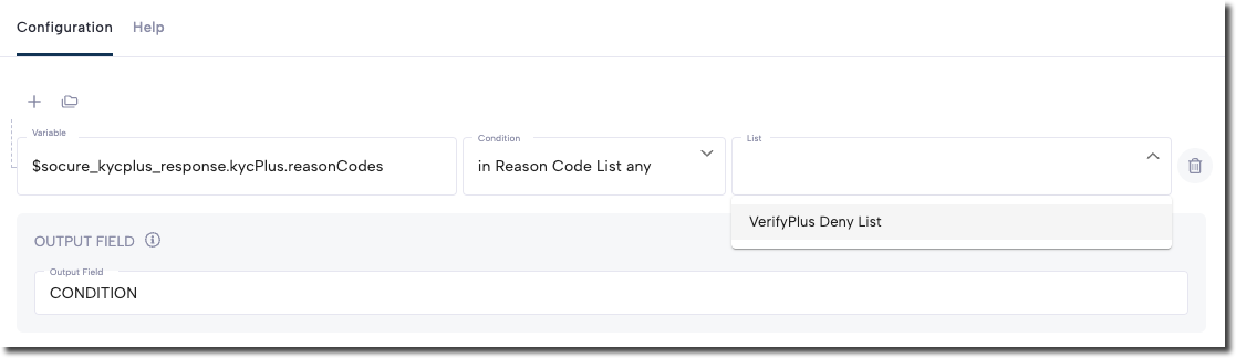Once a reason code list is created, you can use it in a workflow condition. For example, you might write a condition that checks if any of the reason codes in the Verify+ Deny Reason Code List is present. This makes it easy to apply the same set of reason codes consistently across your workflows, improving decision-making and simplifying your configuration.