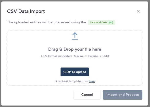 - On the CSV Data Import screen, drag and drop your prepared file or click to browse from your file system.