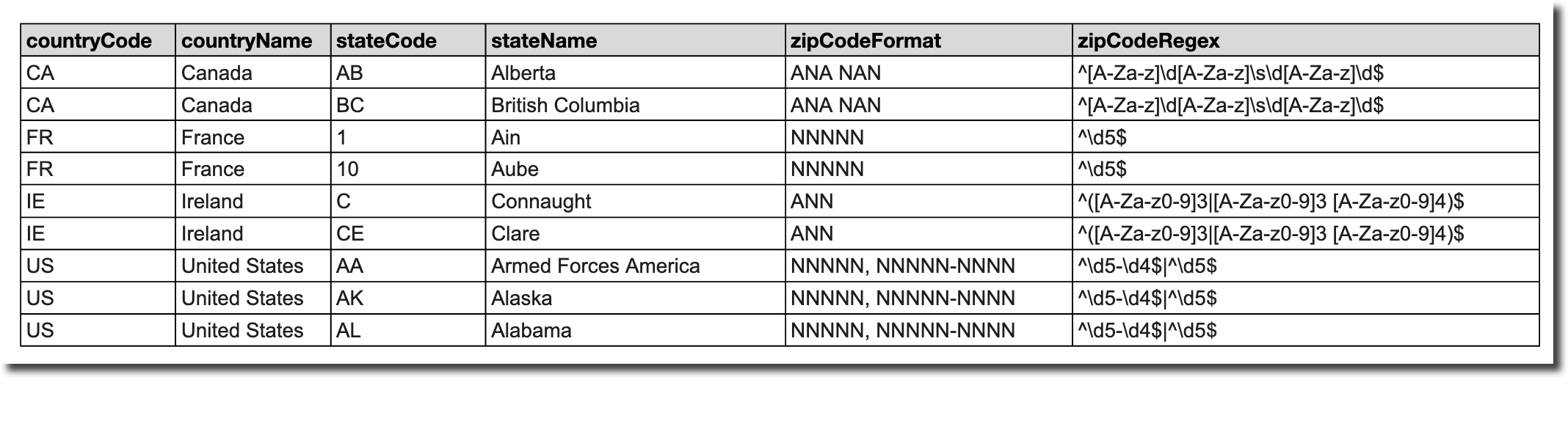 - zipCodeRegex: The regular expression to validate ZIP codes (left blank for countries without postal codes).