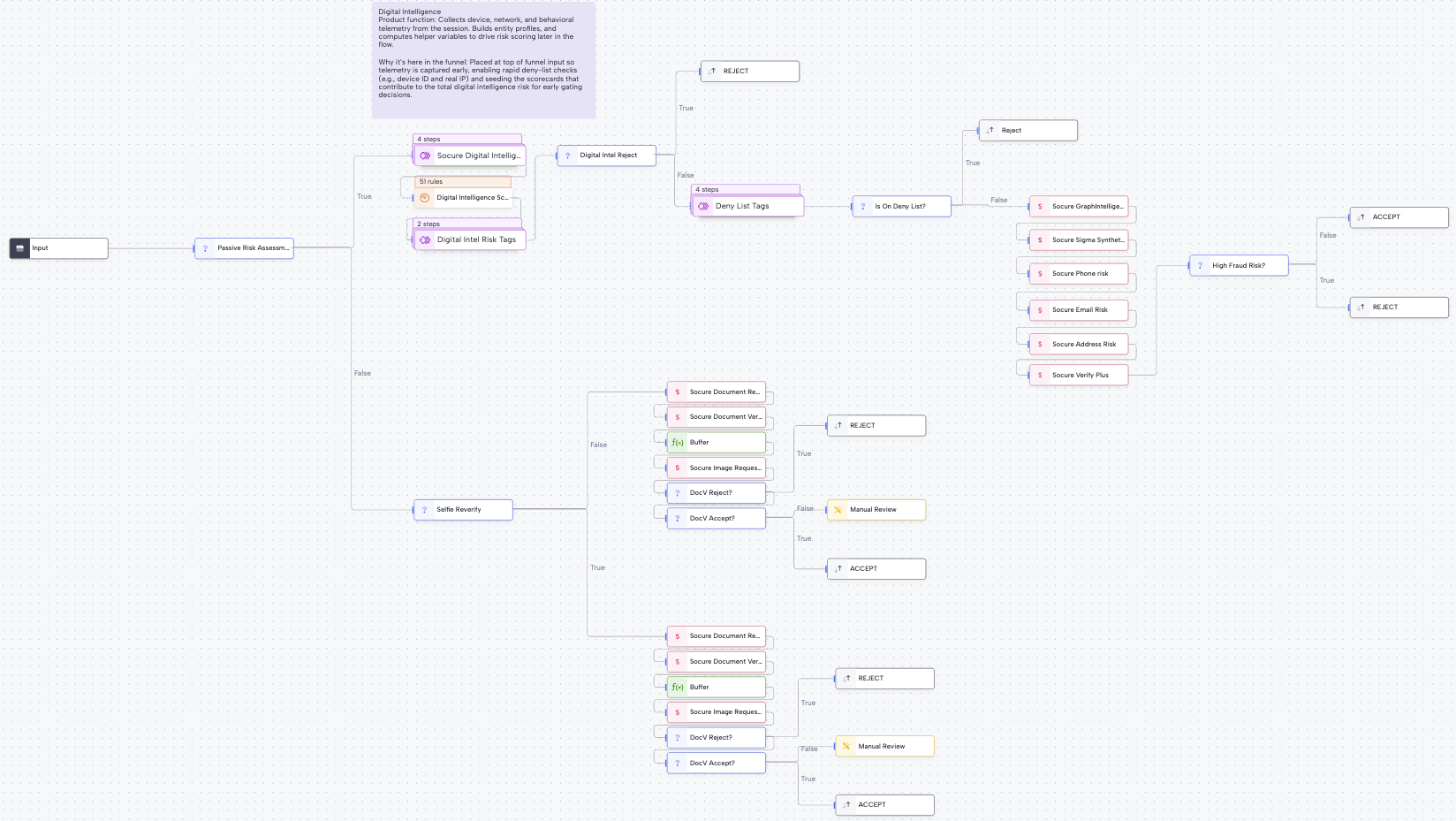 - Check Digital Intelligence (DI) Risk – Device, behavioral, and entity profiler signals are scored using a configurable weighted scorecard. Reject outcome based on DI risk threshold.